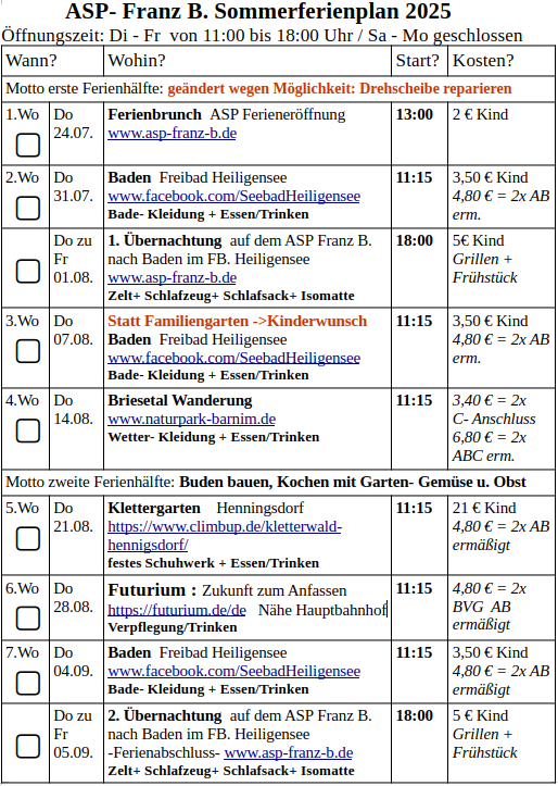 Das hat Spaß gemacht. Viel kostenloses Spielen auf dem Franz B. und jede Menge Reiseabenteuer. Hier ein kleiner Rückblick auf die Sommerferien 2025. Im Oktober kommen schon die nächsten Ferien. Bis dahin stehen wir Euch mit freiem, kostenlosem Spielmöglichkeiten und Hilfe bei Eueren Schulaufgaben zur Verfügung. Euer ASP-Franz B. Team
