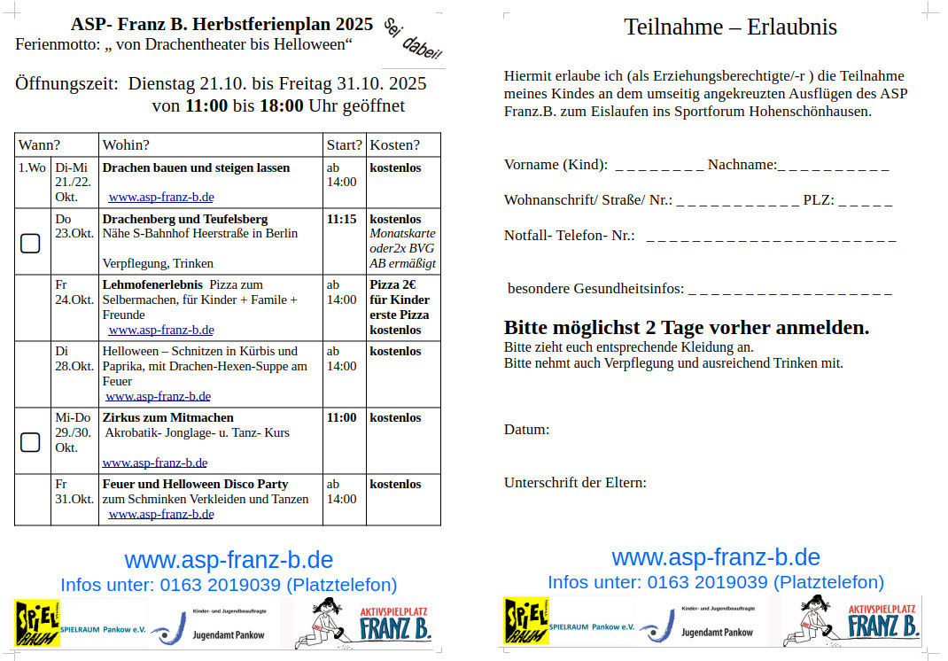 Hallo Kinder. Freut Ihr Euch auch schon auf die Herbstferien? Wir haben auf dem ASP Franz B. einiges zu bieten. Schaut auf unser Ferienprogramm. Meldet Euch zum Ausflug oder dem Zirkus-Kurs an. Seid dabei und habt Spaß. Euer Franz B. Team