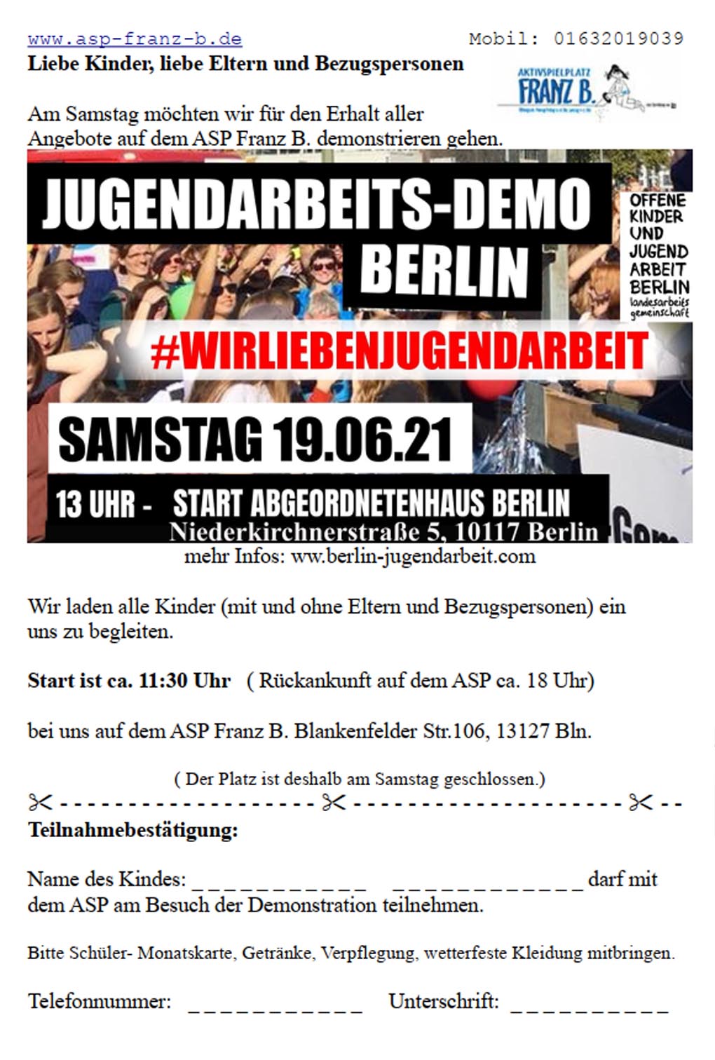 Wir Mitarbeiter*innen wollen bei Themen der Jugendarbeit mitbestimmen und möchten daher an der Demo teilnehmen. Kinder, Eltern und Bezugspersonen, die dieses auch möchten, laden wir herzlich dazu ein, uns auf unserem Demobesuch zu begleiten. Schaut euch dazu unseren Handzettel an und gebt gegebenen Falles die ausgefüllte Teilnahmebestätigung bei uns auf dem ASP Franz B. ab.
