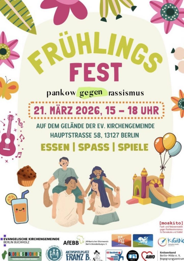 Am Samstag 21.März 2026 präsentieren wir uns auf dem Frühlingsfest in Französisch Buchholz, für Vielfalt und achtsames Zusammenleben , gegen Rassismus und Ausgrenzung. Mit typischen Angeboten unseres ASP, wollen wir Euch zum Vorbeizukommen und selber Mitzumachen einladen.