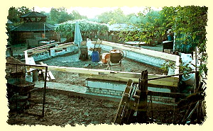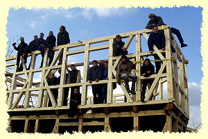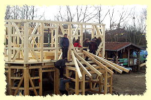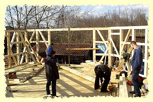 | 2002 - Im September ist es soweit. Wir beginnen mit dem ersten Bauabschnitt. Es entstehen Fundamente und Sockelaufmauerungen. Der Fachwerkaufbau beginnt. Durchgeführt werden diese Arbeiten von Mitarbeitern des Kinderbauernhofes und Studenten der FH Eberswalde Fachrichtung Holztechnik. | ![]() |