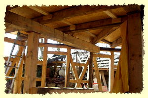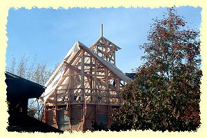 2003 - Bis zum Herbst des Jahres ist das Fachwerk im Erdgeschoss und 1. Obergeschoss sowie der Dachstuhl des Nebenhauses fertiggestellt, zum Jahresende ein Teil des Daches eingedeckt, das Haupthaus mit einem Notdach versehen, das Gebäude winterdicht. Wir haben den ersten großen Abschnitt geschafft. |