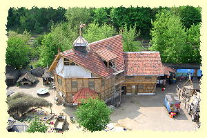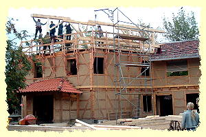 | 2004 - Zusammen mit einer Bauzeichnerin treiben wir die Ausführungsplanung voran. Im Februar beginnen wir mit dem Innenausbau. Es werden Fundamente für Stützen und Innenwände gebaut sowie Innenwände im Erdgeschoss und 1.Obergeschoß gemauert. Die Außenwände werden für die Lehmbauarbeiten vorbereitet. Im April beginnen die Lehmarbeiten und dauern bis in den September hinein. Ende Oktober sind die Lehmarbeiten im EG und 1.OG fertiggestellt, der Innenausbau ist weiter fortgeschritten und der Dachaufbau im Haupthaus beendet, so dass zum Jahres- und Projektende das Spielhaus erneut winterdicht ist. | ![]() |