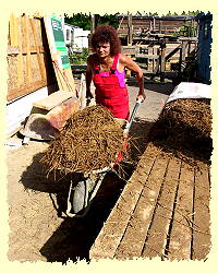 Oktober 2004 "Frau Henze, Sie haben den Job". Ich erhalte die Nachricht, dass ich ab November als Projektleiterin für den Verein Baufachfrau Berlin e.V. arbeiten werde und ein Lehmbauprojekt auf dem Kinderbauernhof Pinke-Panke durchführen soll. 17 MitarbeiterInnen, Frauen und Männer zwischen 20 und 60 Jahren, von ungelernt bis diplomiert, wir alle - mit wenigen Ausnahmen - ohne die nötigen Erfahrungen im Lehmbau. Nachdem ich jahrelang selbständig und eigenverantwortlich für Architektur- und Ingenieurbüros gearbeitet habe, ist das eine ganz neue Herausforderung, die mir anfangs gehörigen Respekt einflößt. | |