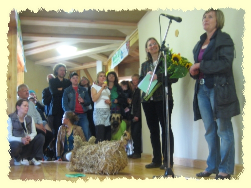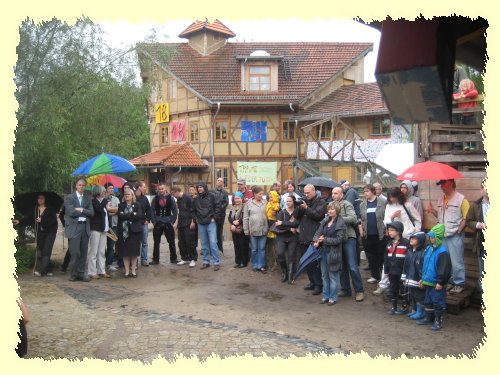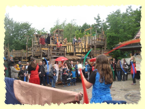 Zur offiziellen, feierlichen Eröffnung des Spielhauses auf dem Kinderbauernhof fühlte sich wohl auch das Regenwetter angesprochen und eingeladen. Wie schon so oft zu unseren Festen, begann es fast pünktlich zum Festbeginn zu regnen, so, als ob die vielleicht allerletzten Zweifler noch davon überzeugt werden müssten: das Haus wird gebraucht.