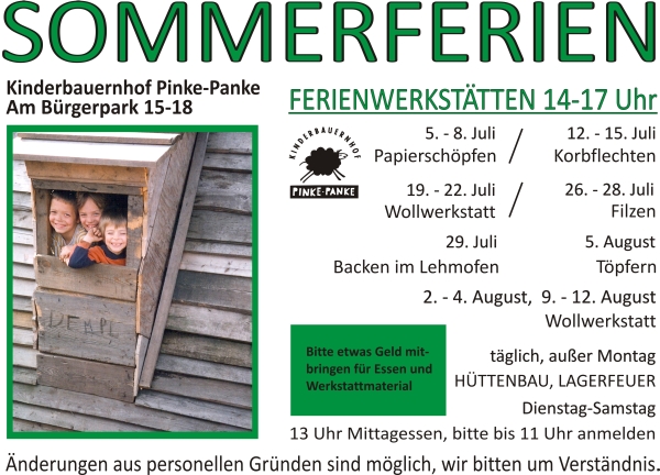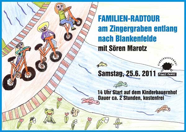 Am Samstag, den 25.06.2011 haben Sie die Gelegenheit, bei einer geführten Radtour den Zingergraben und das Projekt „StadtGut Blankenfelde“ kennen zu lernen. Die vom Kinderbauernhof „Pinke-Panke“ und dem Verein panke.info e.V. veranstaltete Tour startet um 14 Uhr auf dem Kinderbauernhof (Am Bürgerpark 15-18) und ist kostenfrei. Bringen Sie ihre Kinder, die Fahrräder und natürlich gute Laune mit.